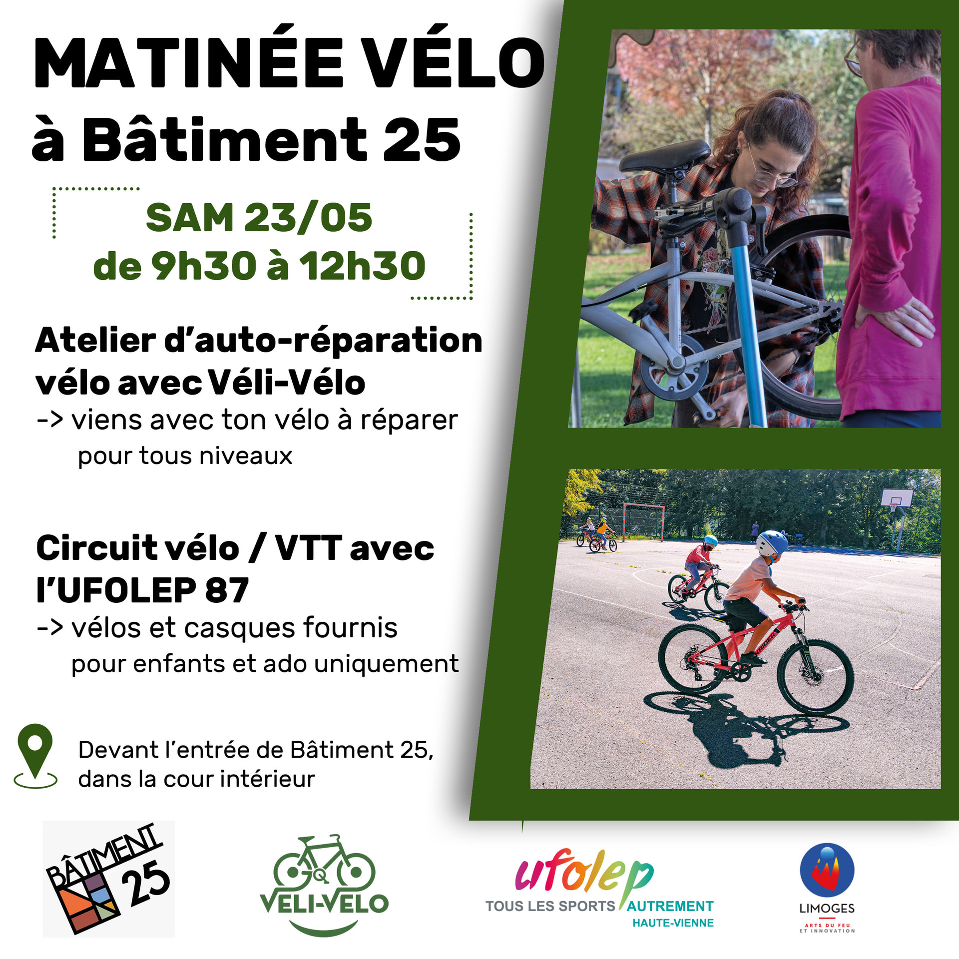 Atelier mécanique ouvert au public avec animation parcours vélo par l’UFOLEP 87 et financé dans le cadre de la CTG de la ville de Limoges.