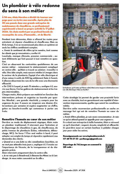 Alain Morelon n’est pas un plombier comme les autres. Cet artisan ne se déplace qu’à vélo. De plus en plus sollicité, il ne manque pas de boulot. Il a souvent la tête dans le guidon